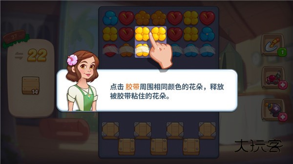 2、胶带:点击周围与被胶带捆的花颜色相同的花元素或使用特效都能对胶带进行消除