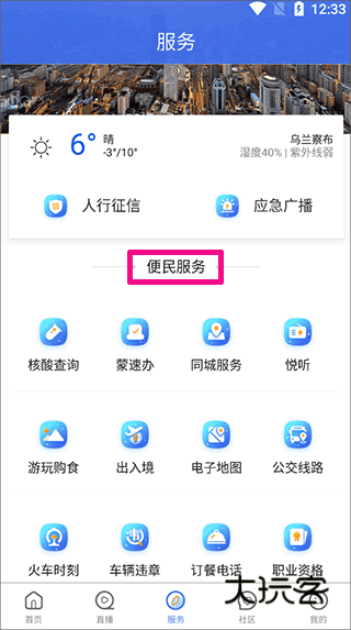 1、首先,打开软件,在服务页面可以看到很多便民服务,点击其中一项即可开始服务;