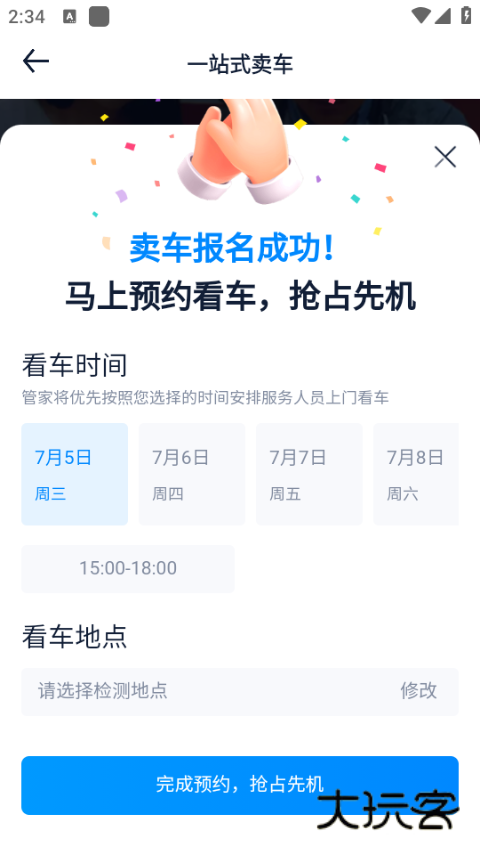 3、选择好预约看车时间和看车地点之后,点击完成预约。