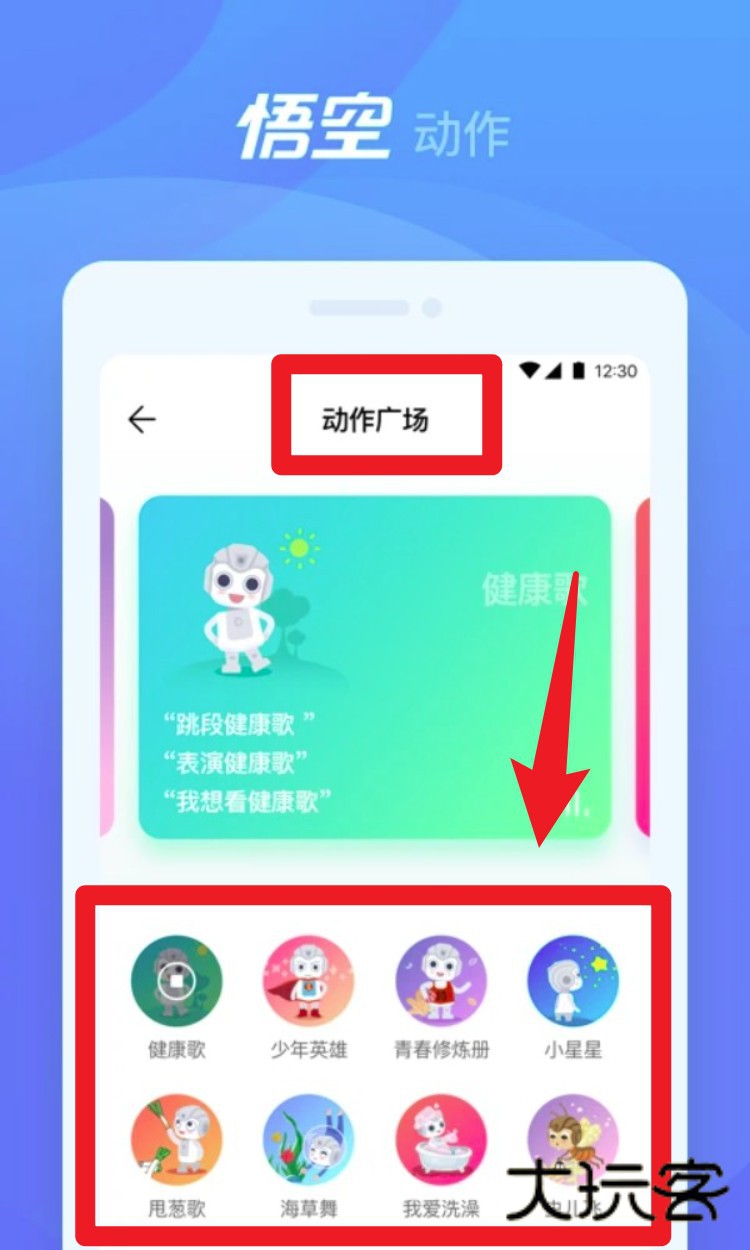 1、进入首页点击「动作广场」,可选择如《健康歌》《我爱洗澡》等动作歌曲,让机器人跟着节奏舞动,陪伴孩子一起活动身体。