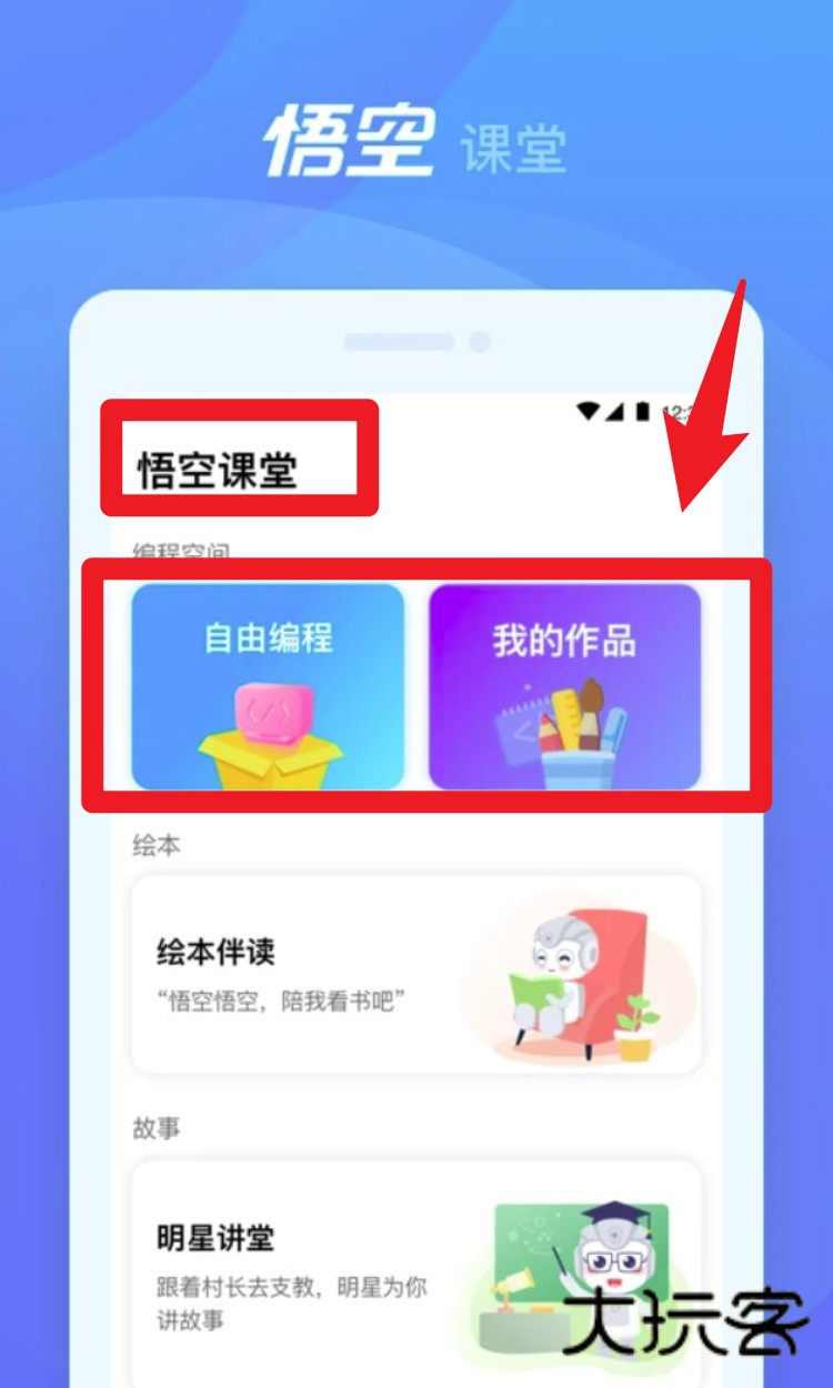 2、在「悟空课堂」中点选「自由编程」或「我的作品」,孩子可进行简单逻辑搭建,也能上传自己的语音或图片进行创意展示。