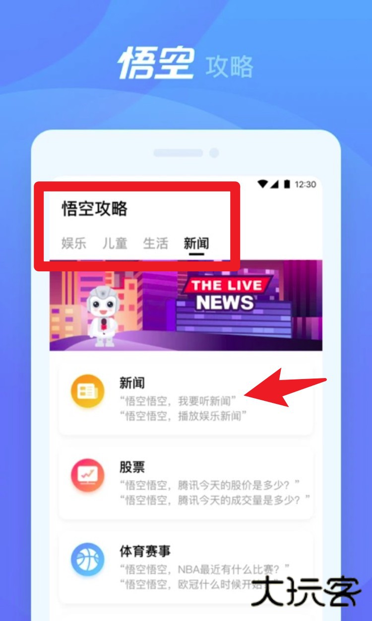 3、前往「悟空攻略」版块,切换到「新闻」标签后,即可通过语音指令播放今日新闻、股市、体育赛事等资讯内容,边听边学。