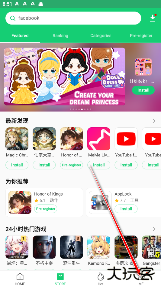 1.打开APKPure,点击底部的Me,点击右上方的小齿轮进入设置