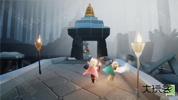 2、找到蓝色人影并触碰它,跟随光点,我们可以看到一个深灰色的石像,点燃石像上的火苗,它就会教我们一个新的互动姿势。