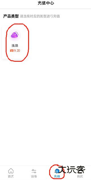 1、注册完成后,打开app,登录账号,点击“充值”,再点击“洗澡”,进行充值,最低充值金额为10元。