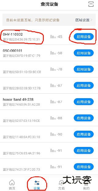 3、打开手机蓝牙和app,点击“设备”,选择对应的设备编号进行连接。