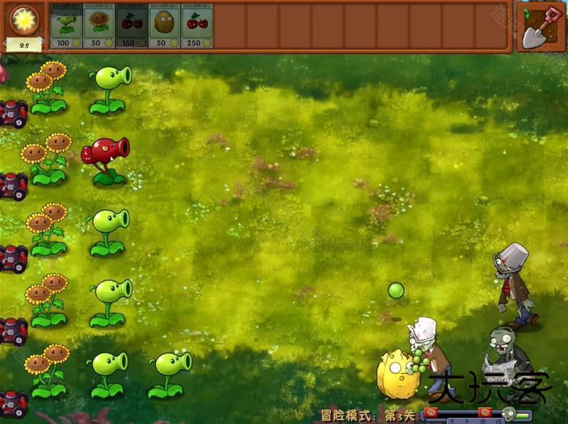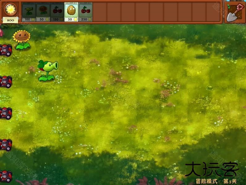 2、使用高于向日葵高度的坚果保护一路,其他路可以都种上“豌豆土豆雷”和“豌豆坚果墙”。