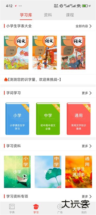 4、点击学习板块,这里涵盖小学生字表大全、字词学习、学习资料等内容
