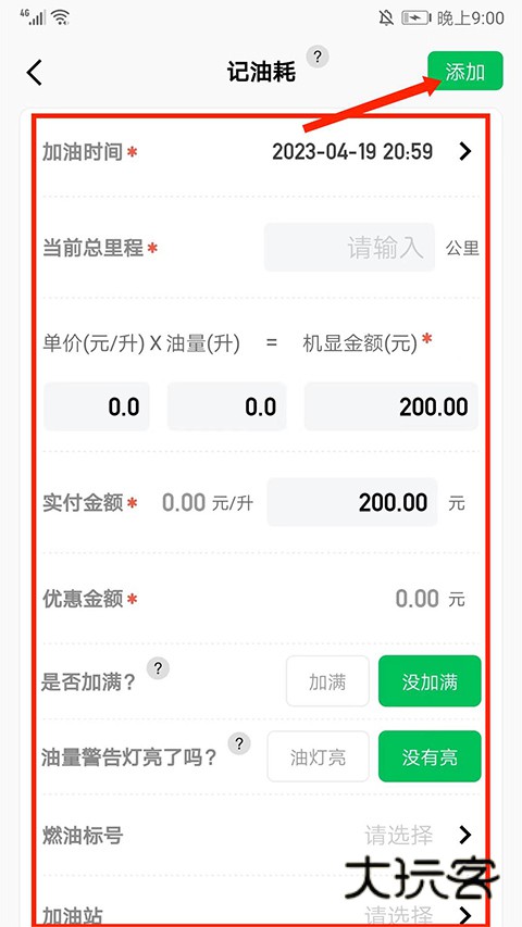 5、进入记油耗界面,依次填写好【加油时间】、【当前总里程】、【加油金额】、【是否加满】、【是否亮灯】后,选择右上角【添加】选项;