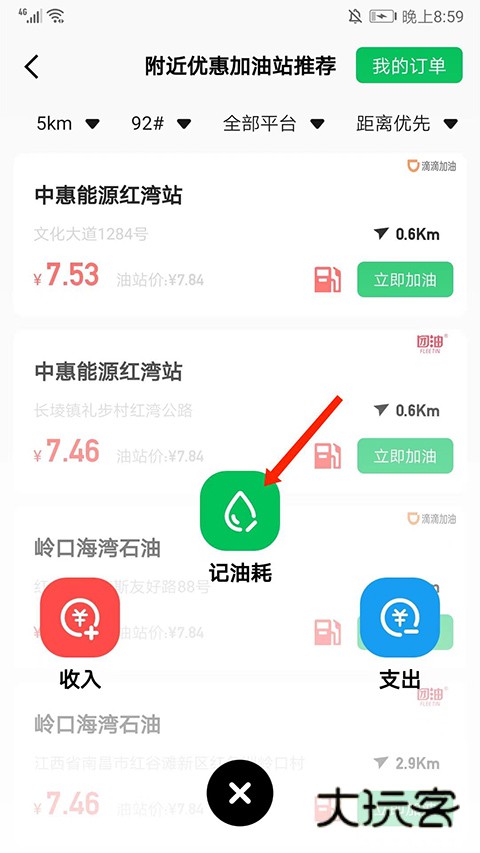 4、返回主界面,选择【记一笔】选项,弹出【收入】、【记油耗】和【支出】选项,我们选择【记油耗】;