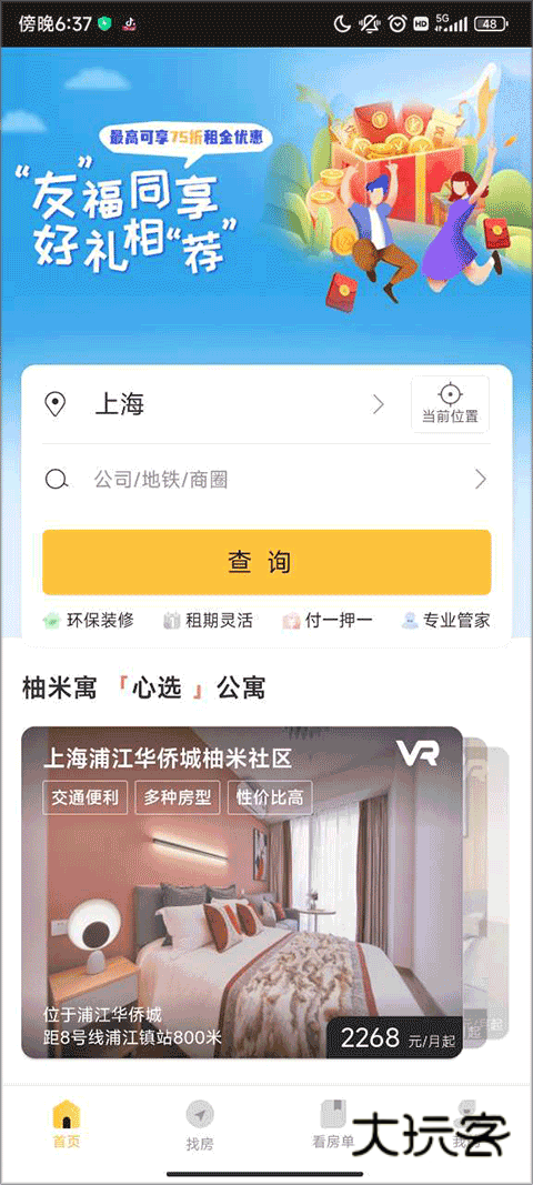 1、下载安装好柚米租房app,进入软件主页面,点击查询。