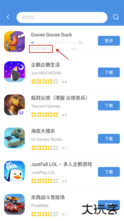 3、小编以最近大热的鹅鸭杀游戏为例,在上方搜索栏输入“鹅鸭杀”即可在下方查看该游戏的评分以及厂商信息,点击一键下载即可。