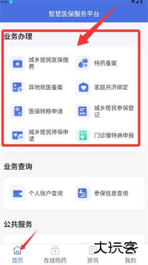 3、在业务办理板块选择所需服务,如居民医保缴费或异地就医备案。