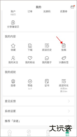 1、打开登录软件,切换到“我的”界面,点击“我的内容”模块中的“投稿”。