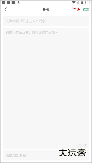 4、就可以开始输入自己写的故事,留下自己的联系方式之后,点击右上角的“提交”,这样就是投稿成功了。