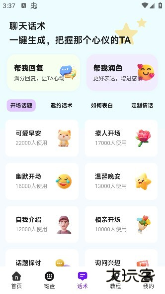 撩人输入法是一款极具趣味的手机输入法工具,软件为用户提供了超多的聊天话术,支持根据对方发送的聊天内容进智能分析,并为用户提供恢复内容进行参考,很好的帮助玩家以更高的情商与好友、异性进行聊天。最重要的是软件体积设计非常小巧,即使后台运行这款软件也丝毫不会对用户的手机性能造成影响。