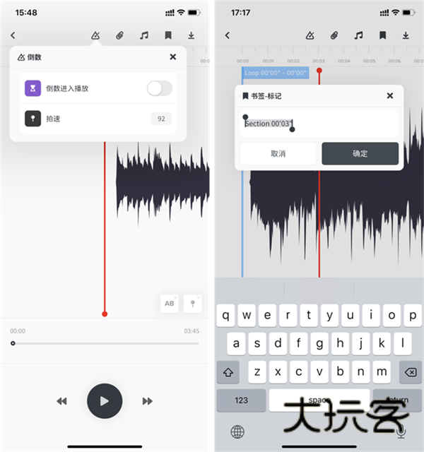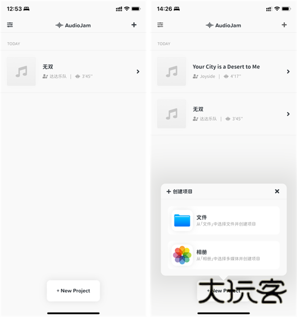 2.、首先就是打开 App 然后点击「+」来创建一个项目,这里需要从 「文件」中导入一个音频文件,支持.mp3、.m4a、.aac、.aiff、.wav 格式的音频文件以及 .mp4、.mov 格式的视频文件。选择导入后,会将其创建为一个工程项目,我们可以看到音频文件已经完成导入,并可以在播放控制页面中看到生成的对应波形。