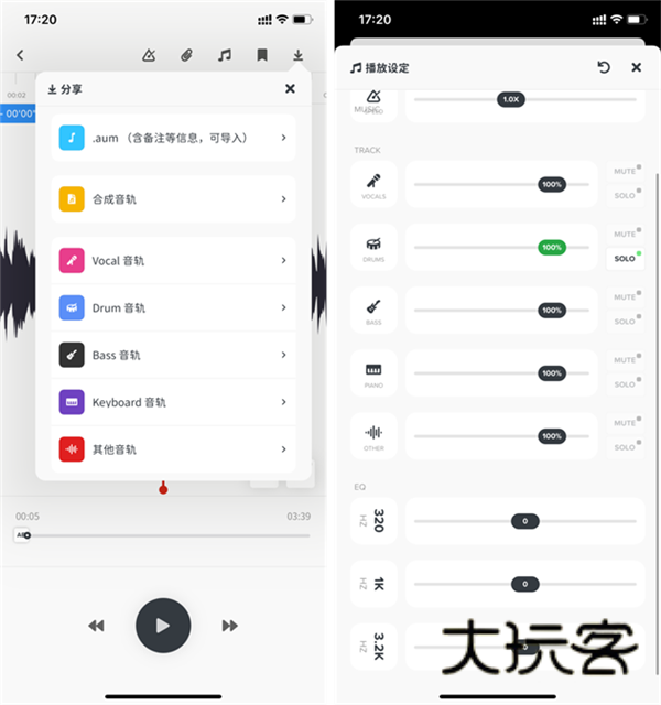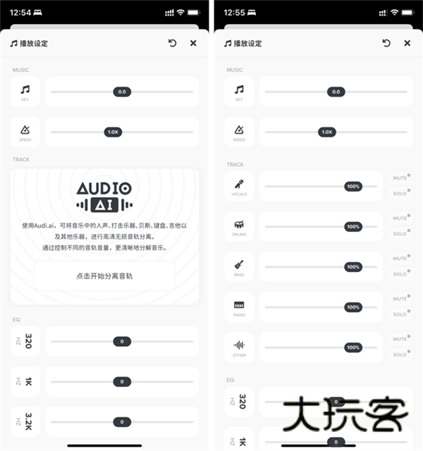 4、想要对当前的音乐进行分离,就需要点击右上方的「播放设定」,我们可以看到在「TRACK」这里的「AUDIO AI」,通过这个功能,我们可以基于人工智能来更高效地分离乐器的音轨,点击这个功能后,音频文件会被上传到云端进行分析,之后会将生成的多个音轨下载回本地完成音轨分离。