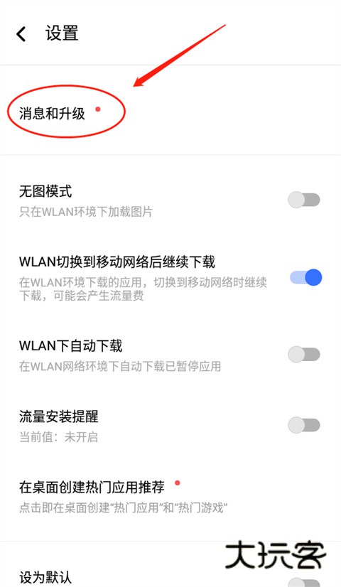 2、点击【消息和升级】。