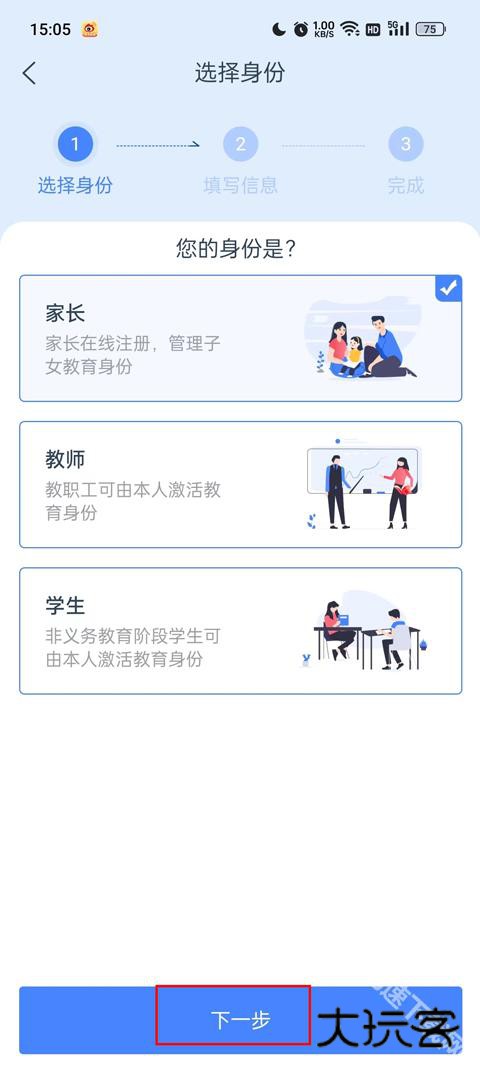 二、在其中选择你的身份进行注册,勾选注册身份,然后点击【下一步】。