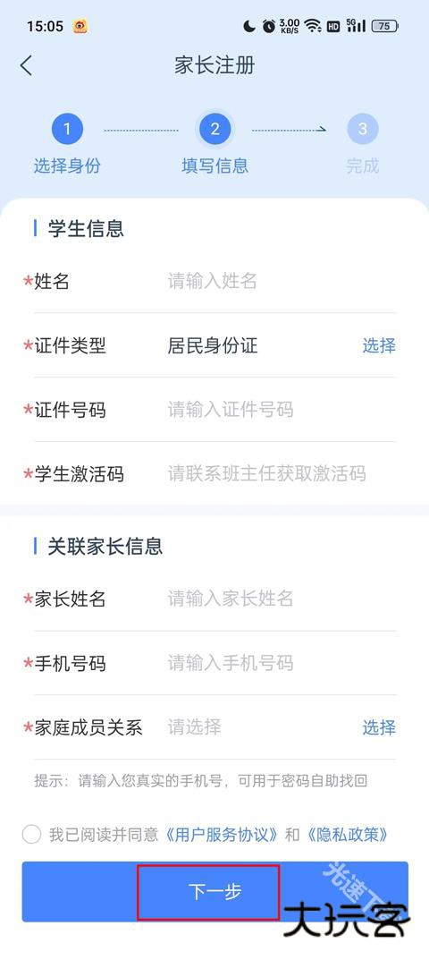三、在填写信息页面,完成【学生激活码】等重要信息的录入后,勾选协议, 再次点击【下一步】,若填写的信息无误,即可完成注册。