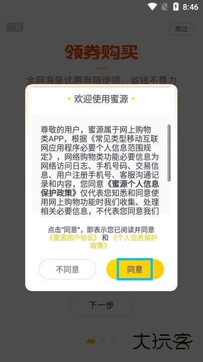 ・在乐乐资源网下载打开蜜源,阅读弹出的内容,点击【同意】;