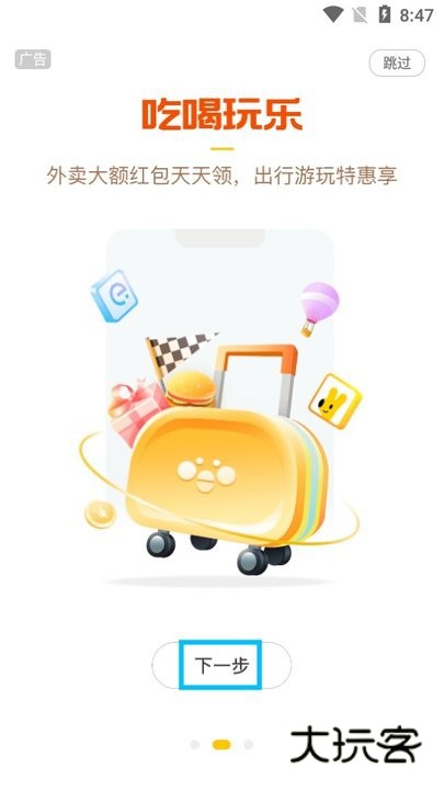 ・吃喝玩乐,外卖大额红包天天领,出行游玩特惠享,点击【下一步】;