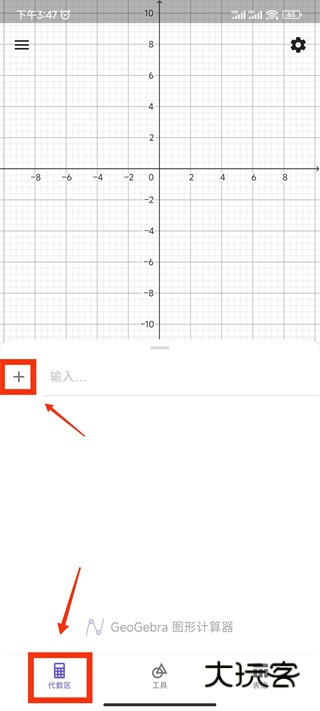 2、在左下角点击切换到“代数区”,接着点击上边的加号图标;