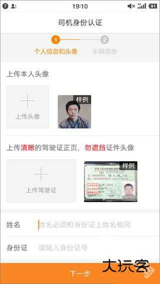 3、进入司机身份验证,提交头像照片、驾驶证图片资料,同时填写姓名和身份证号;