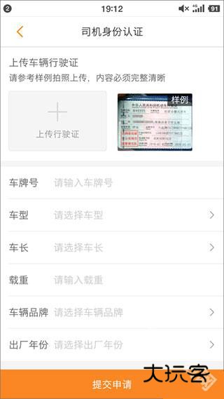 4、上传行驶证照片,输入车牌号、车型、车长、载重、车辆品牌、出厂年份等信息后提交申请;