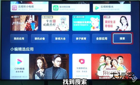 1、打开电视在首页导航栏中找到【应用】,下拉找到【搜索】