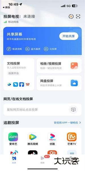 1、下载迅雷看看播放器后可以看见这样的界面,这里可以选择共享屏幕,点击开始共享即可。
