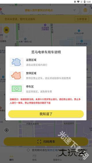 2、然后还需要了解【用车说明】,知道运营区域、禁停区域和停车区。