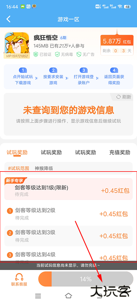 3、以“疯狂悟空”为例,我们可浏览其中的试玩奖励详细,然后下载游戏