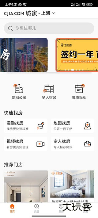 1、下载登录城家公寓,进入首页,可以看到有整租公寓、多人宿舍、城市短租,你可以通过通勤找房、地图找房、视频找房、专人找房进行快速找房。