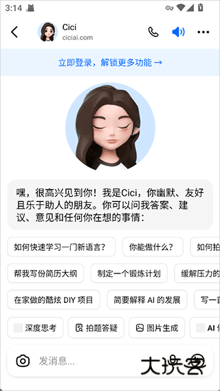 Cici是一款字节跳动旗下的海外版AI大模型聊天软件。该软件部署在海外市场,设置了多国语言交互系统,非常的智能且好用,里面内置了个性化定制体模型,帮助用户在智能对话、AI艺术创作、编程辅助、多语言翻译等提供助理,能够满足用户对学习生活上的大多数需求。虽然服务于国外,但是国内登录也非常方便,感兴趣的小伙伴快来下载试试吧!