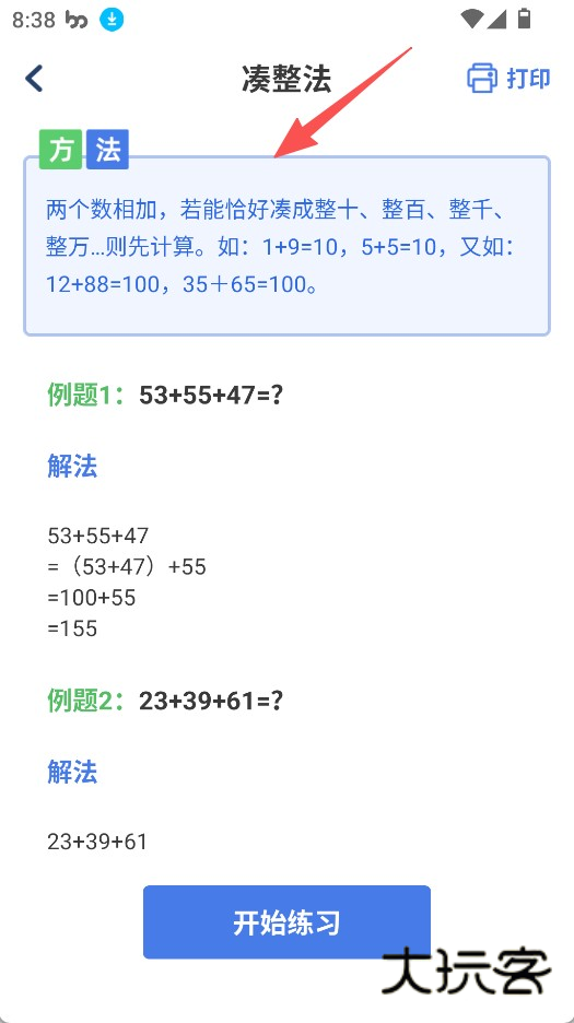 3、学习巧算方法时,查看凑整法等内容,了解方法后,点击开始练习巩固巧算技巧。