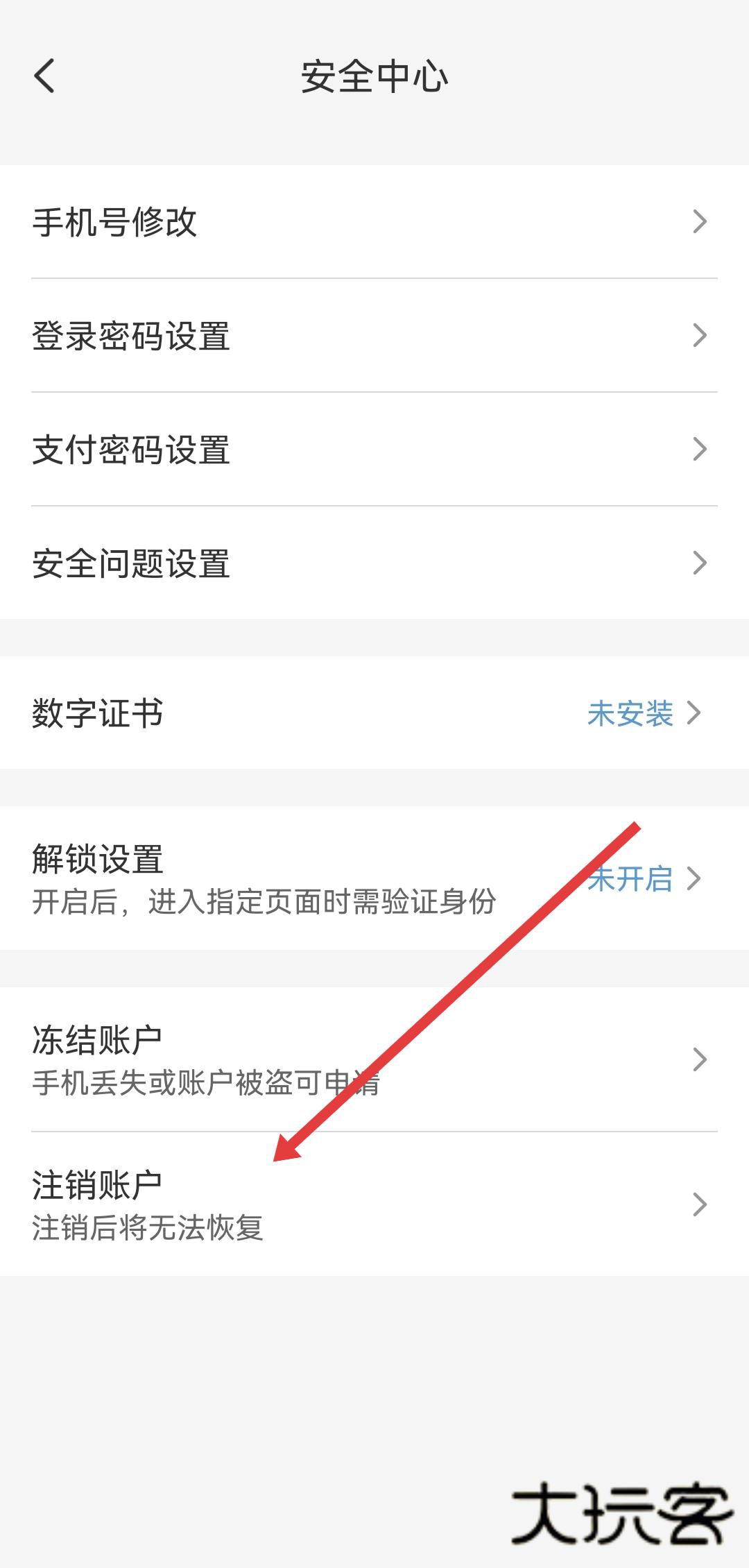 3、在安全中心页面,点击注销账户的选项,后续按照系统提示完成身份验证后即可注销账号。