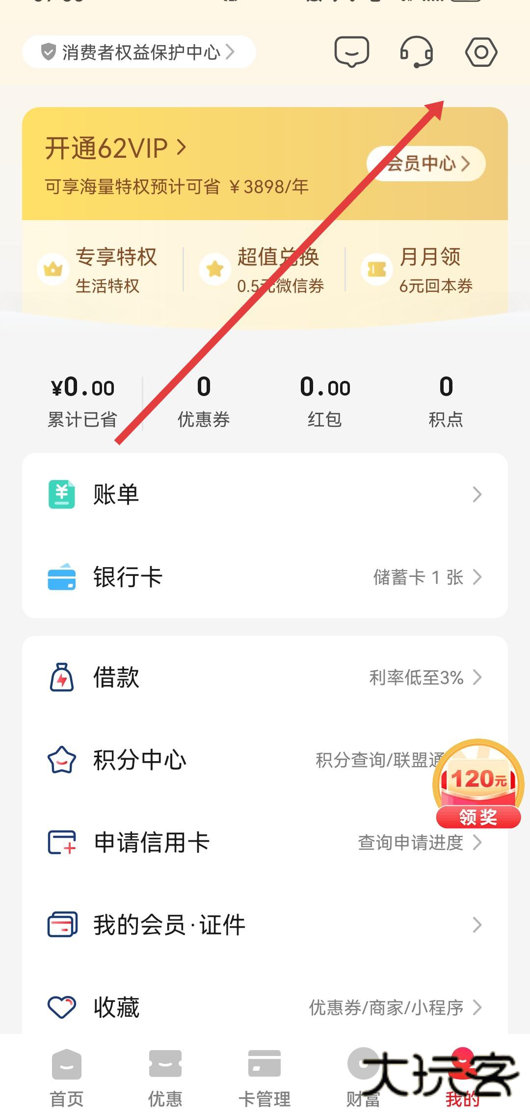 1、打开云闪付,进入我的页面,点击右上角六边形设置的图标,进入设置的界面。