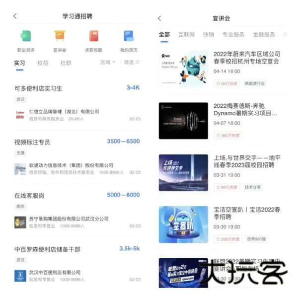 虽然应届大学生在找工作的时候大多是通过老师/家里/校招获得信息,但是学习通上其实也有不少应聘信息,还有宣讲会的实时资讯,也不失为一种获取信息的备选途径!