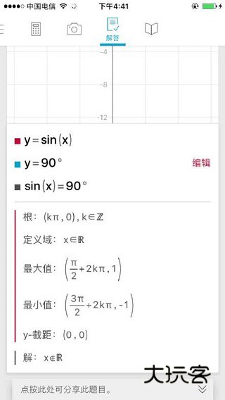 4、在详细的解答中,软件还会给出相关的数学知识以供参考。比如输入sinx=90°,APP会自动显示出sinx=90°的函数图像等相关信息。