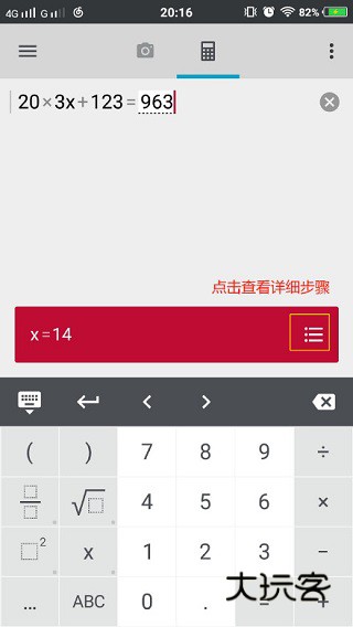 3、在photomath的计算键盘中可以看到,该APP能够实现的多种运算。