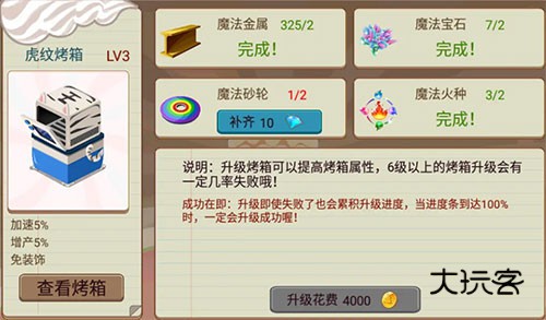 2、升级烤箱要和你升级一样:烤箱里的蛋糕会瞬间烤好,所以你升级烤箱的时候,烤箱里一定要有你任务蛋糕里耗时*长的蛋糕,这样任务就会变得非常容易。(新人是不是都在骂坑爹一个蛋糕烤10几个小时就卖一块?!)人物升级和烤箱升级相配合,就可以解决大部分你被卡住的坑爹任务。
