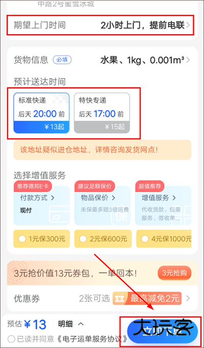 3、在【寄快递】页面,输入寄件地址与收件地址,及货物信息。输入完成后,选择寄件方式:标准快递、特快专递。然后再选择快递员上门时间,以上内容填写完成点击【立即下单】即可完成快递下单,之后耐心等待快递员联系你来取件即可。