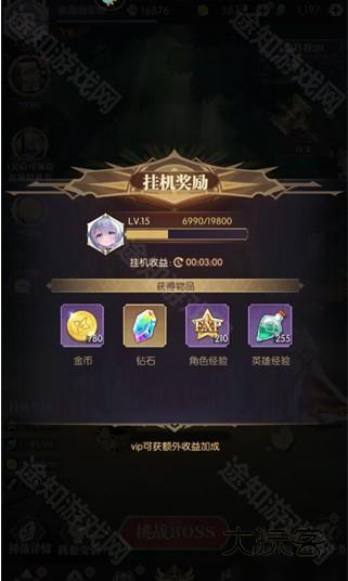 4、挂机除了可以升级之外,还可以获得金币、钻石以及英雄经验;