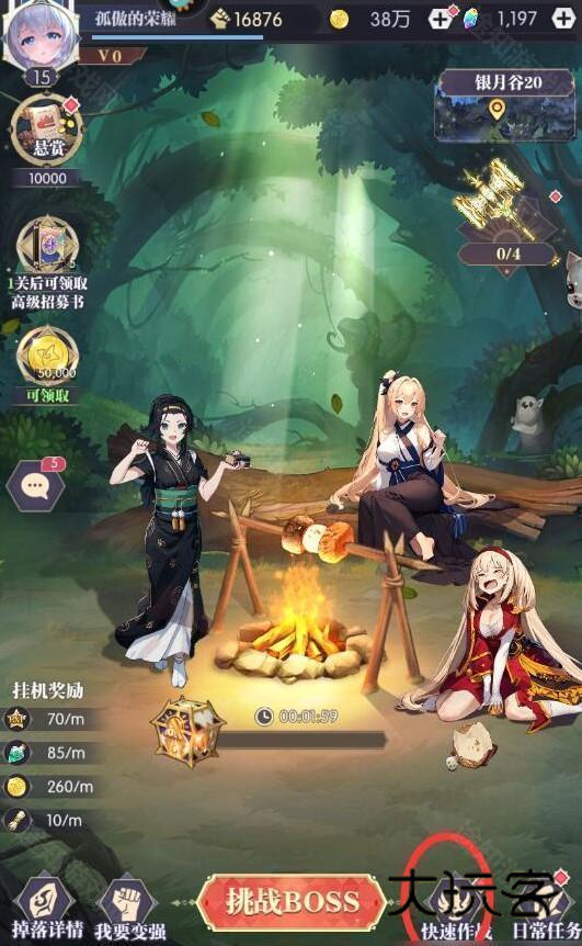 3、除了挑战BOSS可以升级之外,还可以通过挂机升级,点击战斗界面的挂机图标;