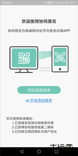 1、打开app,点击扫码连接服务扫取已获得的协同服务链接的二维码