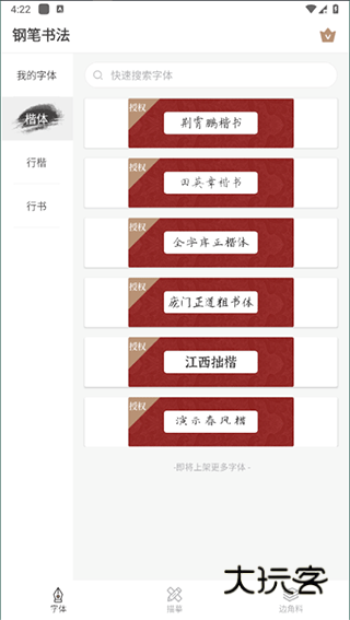 钢笔书法,专为书法爱好者打造的一款很文艺的手机练字软件,汇集了丰富的名家字体资源,如楷体、行楷、行书等,并且支持在线临摹,简体繁体都有,而且还可以自定义文本内容生成电子字帖,让用户可以高度制定适合自己的字帖,生成的电子字帖用户也可以直接打印出来。