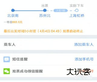 5、记得将短信开启,这样就不会错过漏下余票的通知,然后点按蓝字添上乘车人。