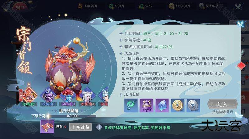 宗门内的玩家获得宗门战帖后可以提交至宗门首领处,提升宗门首领的珍稀度。宗门首领被击败时,所有对宗门首领造成伤害的成员都可以拾取一份由首领掉落的奖励。